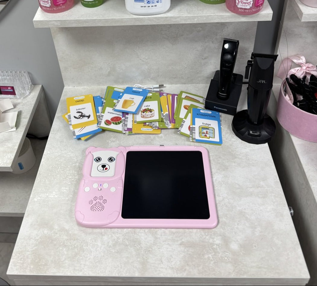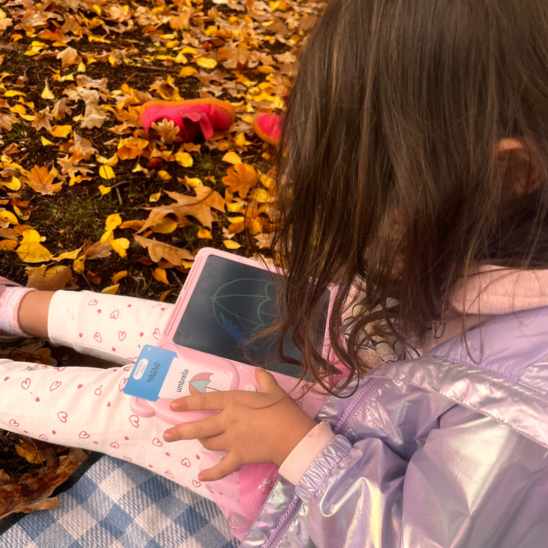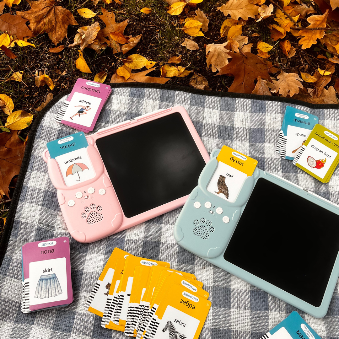 KokoLearn съчетава говорещи карти и таблет за рисуване, превръщайки ученето в игра. Детето слуша, повтаря и рисува – развивайки едновременно езикови и творчески умения.